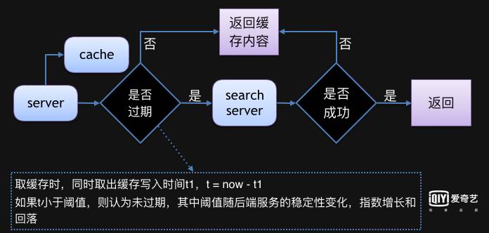 如果取到的缓存已过期,那么去请求后端模块,如果请求后端模块失败了,可以返回过期的缓存的内容。因为对于视频搜索来说,返回一个稍微旧点的结果,要远远好于不返回结果。