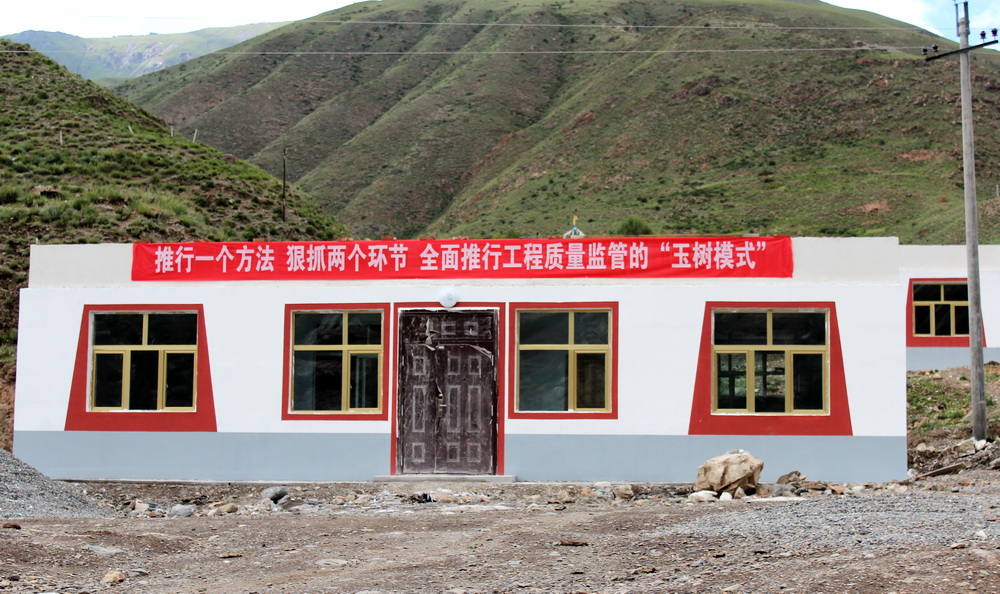 红标语上写着:“推行一个方法 狠抓两个环节 全面推行工程质量监管的‘玉树模式’”。什么是“玉树模式”?每户面积仅有80平方米的重建房,即“玉树模式”吗?