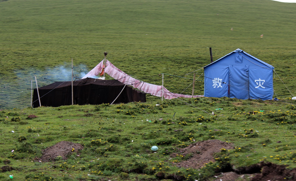 这蓝色的“救灾”帐篷,一路上处处可见。
