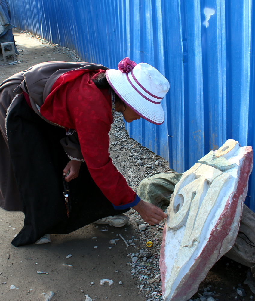在嘉那玛尼堆周围,尘土飞扬。一个年轻的藏人女子正弯腰,试图去抹掉蒙在一块刻着“嗡”的玛尼石上的尘土,她甚至用嘴去吹拂。但是,来来往往的汽车和挖掘机啊,激起的尘土又立刻蒙住了玛尼石……