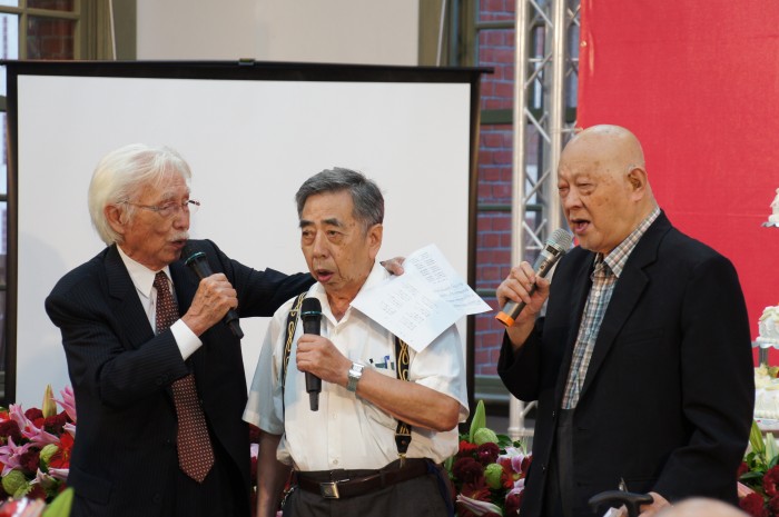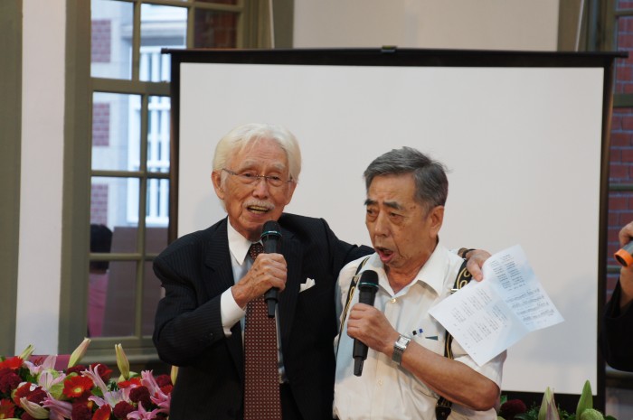 唱畢之後,辜老學長脫稿演出,拿了麥克風跟大家講了今天最最動人的一段話。辜老前輩說,我們臺北高等學校畢業的這些學生,感到最悲哀,最最悲哀(他講了好多好多次),就是我們的學校「不見了」(又強調好幾次)。他說,我們的學校,臺北高等學校,在戰後變成師大,所以我們的學校不見了。但是,今天他很感動,因為看到師大這樣重新找回與高等學校的連結,你們叫我前輩,我當你們是後輩。他今天才深深覺得,臺北高等學校沒有不見了,因為現在的師大,終於開始找回自己的過去與歷史。所以,他最後的一句話,代表了無數天上與人間臺北高等學校學子的心聲是:「謝謝師大!」。我想,這是今天,最完美與最棒的一段佳話。只不過,在校園官方的師大新聞裡,完全不見這一段插曲喔!