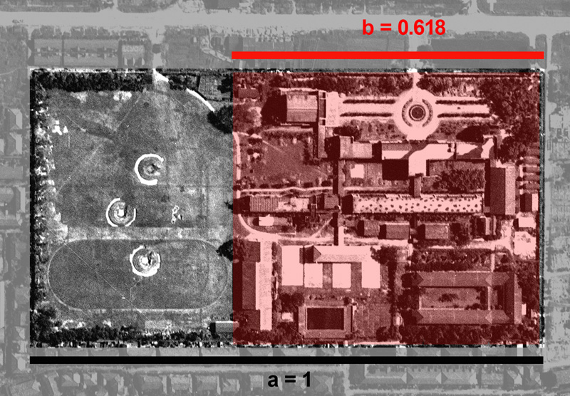 以師大校園來說,整個校園規劃是個高明的設計與切割。教室建築區與操場空地的保留關係,正好是用黃金比例來切分,教室區 的總面積(就是b)剛好是整個區域(a=1)的0.618。而你相信嗎?操場空地區(也就是a-b)除以教室區面積(也就是b)的數字,也正好是 0.618。神奇吧!