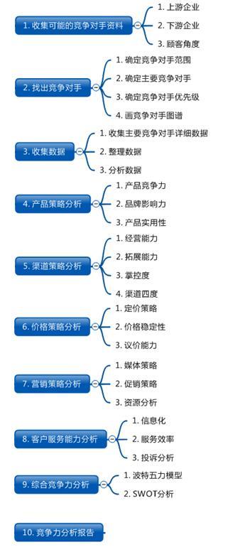 竞争对手分析共分为10个步骤,如图1是分析路线图。这个分析路线图侧重于企业前端即营运端的分析。