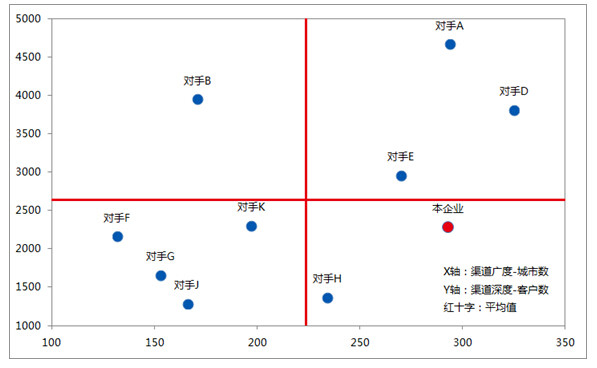 四象限法适合对两个指标进行分析,如图5所示,这是个对竞争对手渠道广度和渠道深度的分析图。和竞争对手相比本企业覆盖了293个城市,广度不错,但是深度只有2283个客户,低于2644的平均值,偏低,和竞争对手A相比渠道深度差距相当大。