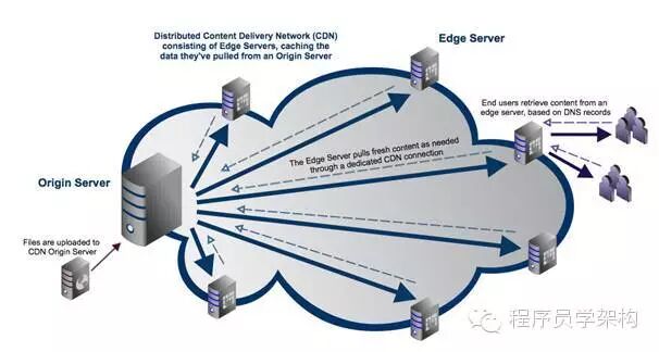 通 常,内容分发网络(CDN)采用分布式模型。在这种模型里, 用户的文件存放在一个源服务器上,并且由大量边缘服务器负责分发这些文件。这些边缘服务器的磁盘空间比较小,所以大多数的文件被放在内存中。因此,当一个 文件传输至终端用户之前,如果该文件在边缘的CDN缓存服务器上不存在,那么这些服务器会先去原始服务器请求该文件或流。