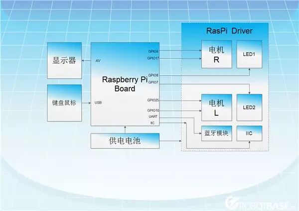 树莓派虽然只有信用卡大小,但是内心却非常的强大,视频,音频等功能都是有的,现在树莓派3版本有1G内存,1.2GHZ频率,拥有操作系统的树莓派预留了40个可以驱动各种传感器和驱动器的 I/O 接口,所以我们使用树莓派作为机器人的控制器,将控制软件写入树莓派的TF卡中,然后这个软件通过 GPIO 接口就能控制驱动和传感器了。