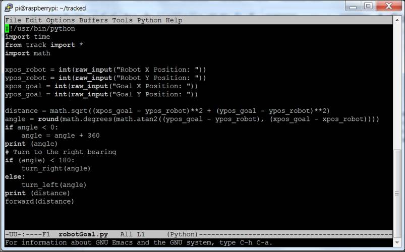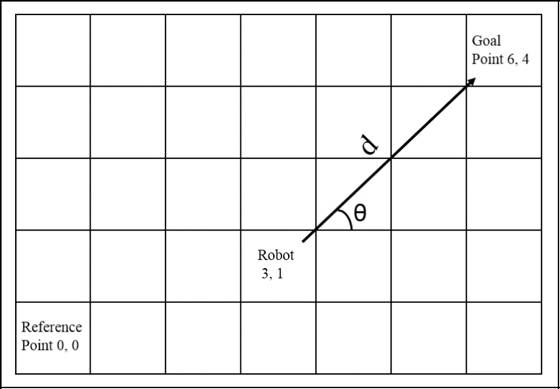 第三个关键位置是目标位置,目标位置也会用X轴和Y轴上相对于固定参照位置 的坐标来表示。如果知道起点以及起点和目标位置之间的角度,就可以规划到 达目标位置的最优的(距离最短)路线。可以根据目标位置、寻迹小车的位 置和一些简单的数学公式来计算寻迹小车和目标位置之间的距离和角度。