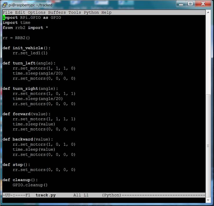 根据之前的说明,rr.set_motors( ) 可以实现单独指定每个电机的速度和方向。现在已经有基本的代码实现对寻迹小车的驱动,还需要进一步修改这些代码来实现在其他 Python 程序中调用这些函数。还需要增加一些标准位移使寻迹小车能够按照指定角度转向或移动一定距离。代码如下图所示: