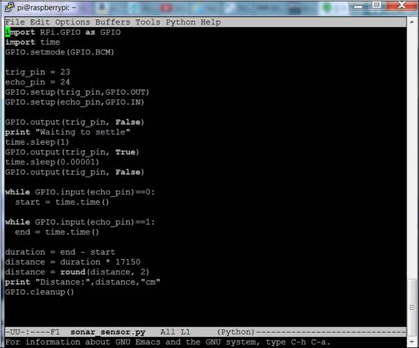 当传感器连接完成后,需要一段代码来读取传感器返回的数值,先将传感器固定(在静态测试情况下),然后程序转换成距离,下图是程序的 Python 代码。
