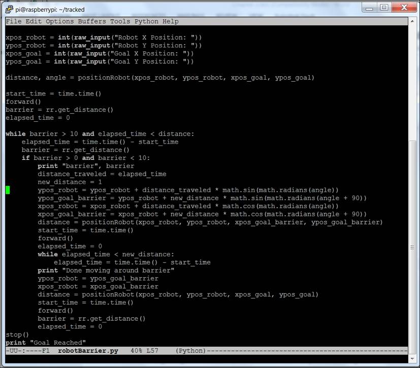仍然可以使用同样的计算方法获得起始的行进角度;但是,现在需要使用声纳传感器去检测障碍物。当声纳传感器检测到障碍物,寻迹小车就需要停下来并且重新计算避开障碍物的路径和到达目标位置的路径。