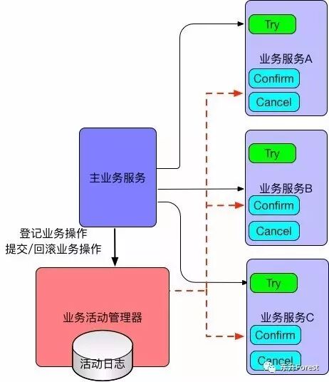 主业务服务分别调用下游业务执行try操作,并在活动管理器中登记所有下游服务。当所有下游微服务的try操作都调用成功,或者某个下游微业务服务的try操作失败。