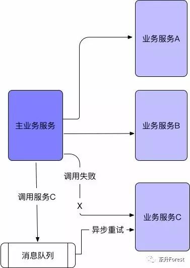 对于Case2, 采用的方案如下图所示,主服务依赖于A,B,C 三个下游服务,同步调用过程中,服务C调用失败。由于服务C不是强依赖,我们便可以给消息队列发送一条消息,保证主服务可以正常返回,同时保证服务C能继续被执行,保证数据的一致性。