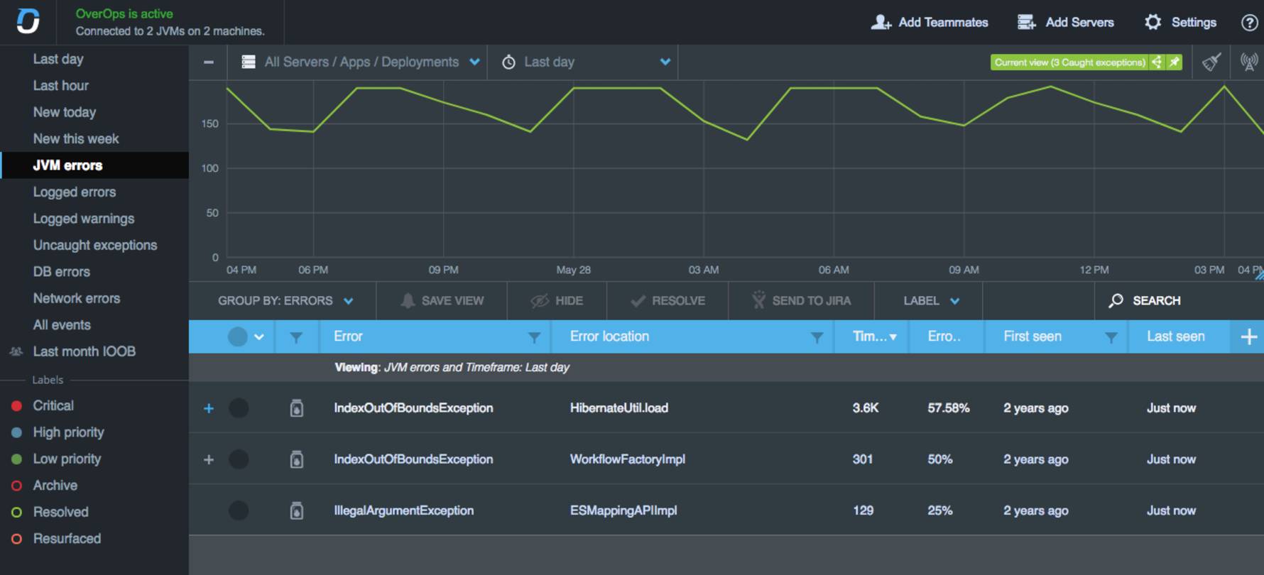 你可以看到实时异常,并记录错误或警告,然后过滤出特定的错误,例如与JVM、数据库或网络有关的错误。