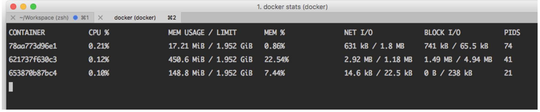 首先,我说一下Docker自带的API接口,因为很多其他的工具是基于这个接口提供的数据,然后添加来自其他地方的信息。一个简单的docker stats命令可以让你一览容器的CPU、内存和I/O使用情况,其他API端点可以提供任务、日志、时间等等指标的具体情况。