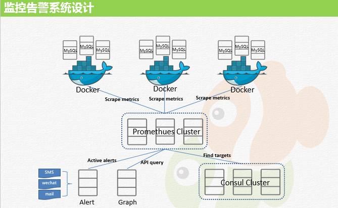 prometheus 是支持 pushgateway 和 pull 的方式。我们选用了 pull 的方式。因为结构简单,开发成本低的同时还能和我们的系统完美对接。consul 集群负责注册实例信息和服务信息,比如 MySQL 实例主从对应的服务、Linux 主从对应的服务、容器注册对应的服务。然后 prometheus 通过 consul 上注册的信息来获取监控目标,然后去 pull 监控数据。监控客户端是以 agent 的形式存在,prometheus 通过 HTTP 协议获取 agent 端采集到的数据。