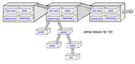 这是利用哈希算法将⼀组数据创建为⼀棵哈希树结构,⽤于验证数据完整性的一种结构,同时也应⽤在了轻量级钱包中。不同的区块链系统对梅克尔树的应⽤不尽相同,比特币中是⼆叉梅克尔树,比较简单,通过交易事务的哈希值两两配合生成一棵树,以太坊这种就复杂的多了,称之为梅克尔.帕特⾥夏树,这里暂时不赘述。