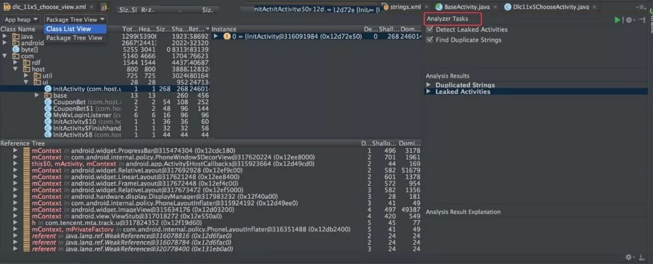 LeakThread每隔段时间就去检测该ref.get()是否为空,如果为空则说明正常释放,不为空就手动触发gc,再隔断时间去查看是否已被回收。如果没有就dump heap,进而分析并计算到gc roots的最短路径,判断是否有泄露,如果有,就通知出来。