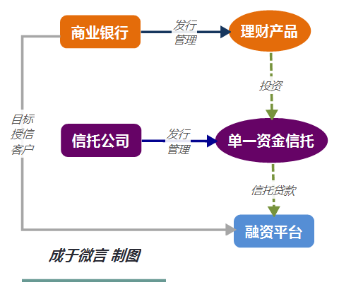 理财资金不能够直接发放贷款,要形成债权必须通过资金信托计划放款。银信合作则是2009年之后绕道监管的利器,银信合作从2009年9月底0.6万亿元激增到2010年上半年末2.8万亿元,其中融资类产品占比高达64%,大量资金流入了地方政府融资平台、房地产业、“两高一剩”行业,严重影响了宏观调控目标的实施。