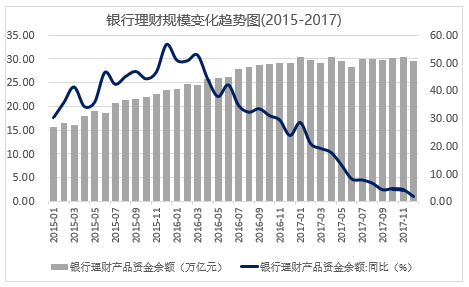 2017年,银行理财也走过了较为艰难的一年,受严监管影响和资管新规的预期,银行理财规模同比增速大幅下滑至1.69%。全国共有562家银行业金融机构有存续理财产品,存续产品数9.35万只,存续规模29.54万亿元,较年初仅增加0.49万亿元。同业理财存续余额为3.25万亿元,比年初减少2.74万亿元,以往通过吸收同业存款、发行同业存单等同业融资对接银行理财的模式在“金融去杠杆“的大背景下难以为继。