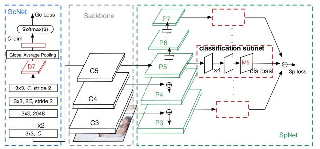 GcNet 网络起到全局分类的作用,将图片分为正常、性感、色情三个类别中。GcNet 将骨干网络的最后一层 feature map 作为输入,通过五层卷积层生成 feature map。每层卷积后都应用 ReLU 操作进行线性整流。对进行全局均值池化后连接到一个输出为三单元的全连接层,对图像进行三分类。
