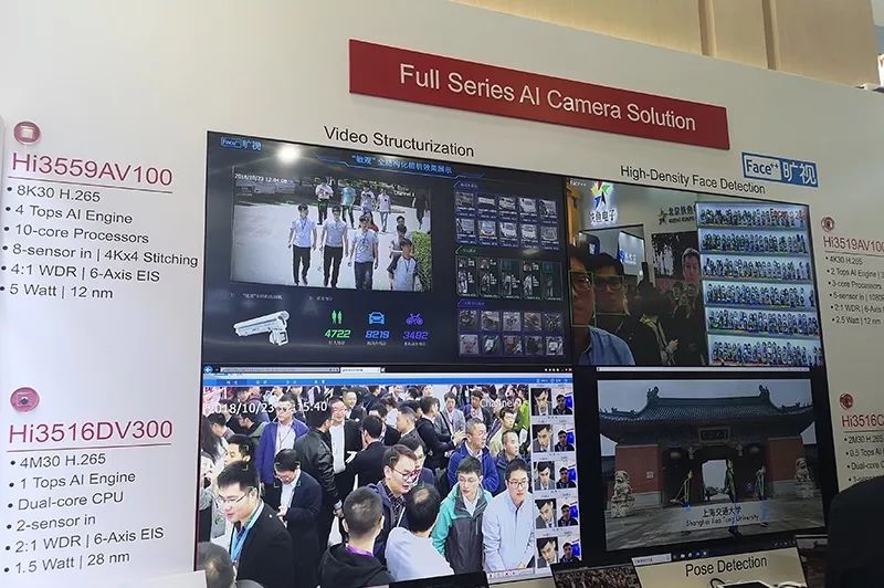 今年海思面向安防市场一共发布了四款AI芯片,在算法层面与旷视、商汤、依图、云从、深瞐科技展开了不同层面的合作,其中与旷视的合作深度和等级最高。在海思的展台区较为醒目的位置首次露出了旷视的Logo。