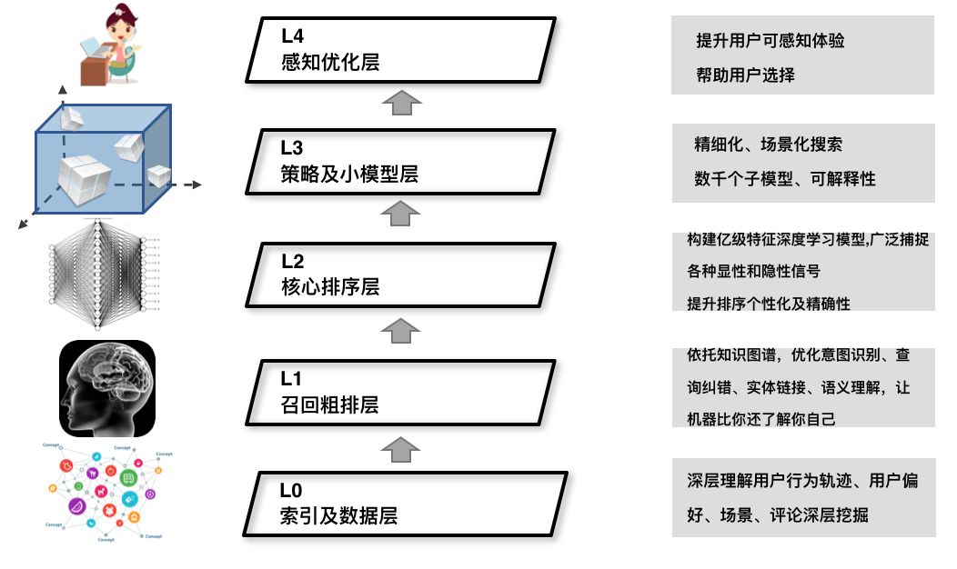 美团NLP中心正在构建全世界最大的餐饮娱乐知识图谱——美团大脑(相关信息请参见《美团大脑:知识图谱的建模方法及其应用》)。它充分挖掘关联各个场景数据,用NLP技术让机器“阅读”用户公开评论,理解用户在菜品、价格、服务、环境等方面的喜好,构建人、店、商品、场景之间的知识关联,从而形成一个“知识大脑”[1]。通过将知识图谱信息加入到搜索各个流程中,我们对点评搜索的整体架构进行了升级重塑,图1为点评搜索基于知识图谱搭建的5层搜索架构。本篇文章是“美团大脑”系列文章第二篇(系列首篇文章请参见《美团餐饮娱乐知识图谱——美团大脑揭秘》),主要介绍点评搜索5层架构中核心排序层的演变过程,文章主要分为如下3个部分: