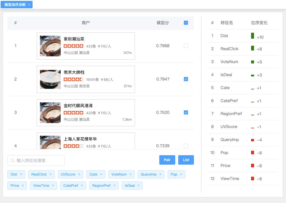 Pairwise模式用来解释同一个列表中两个结果之间的相对排序。通过对样本的特征进行重新赋值或者替换等操作,观察样本打分和排序位次的变化趋势,诊断出当前样本排序是否符合预期。如下图所示,通过右侧的特征位次面板可以快速诊断出为什么“南京大牌档”的排序比“金时代顺风港湾”要更靠前。第一行的特征位次信息显示,若将“金时代顺风港湾”的1.3km的距离特征用“南京大牌档”的0.2km的距离特征进行替换,排序位次将上升10位;由此得出,“南京大牌档”排在前面的决定性因素是因为距离近。