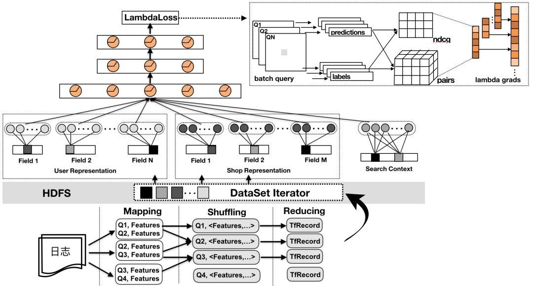 我们利用TensorFlow分布式框架训练LambdaDNN模型。如前文所述,Lambda梯度需要对同Query下的样本进行计算,但是正常情况下所有的样本是随机Shuffle到各个Worker的。因此我们需要对样本进行预处理: