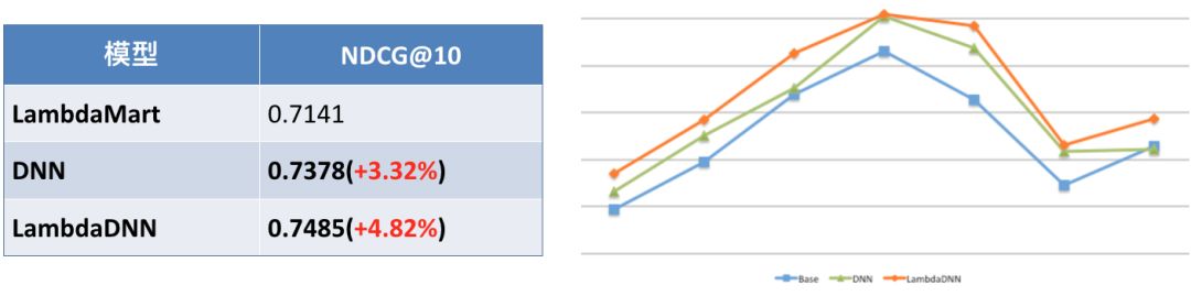 经过上述对NDCG计算改造训练出的LambdaDNN模型,相较Base树模型和Pointwise DNN模型,在业务指标上有了非常显著的提升。