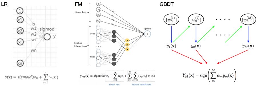 在排序模型方面,点评搜索也经历了业界比较普遍的迭代过程:从早期的线性模型LR,到引入自动二阶交叉特征的FM和FFM,到非线性树模型GBDT和GBDT+LR,到最近全面迁移至大规模深度学习排序模型。下面先简单介绍下传统机器学习模型(LR、FM、GBDT)的应用和优缺点,然后详细介绍深度模型的探索实践过程。