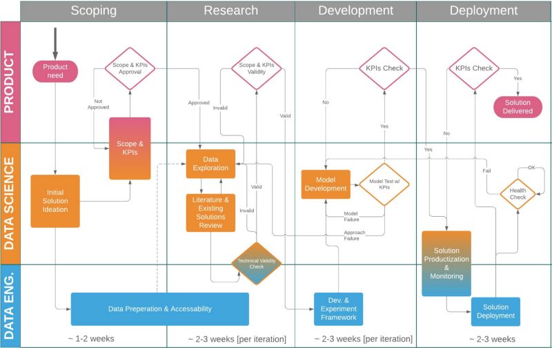 这常常意味着首先需要建立完善的工作通道,从数据源到可规模化的模型,在整个规划中给数据预加工、特征生成以及模型本身留着位置。随后在数据科学这部分进行迭代,同时保证整体范围与现有基础设施的承载能力和部署能力契合。