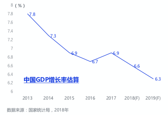 中国已成为全球第二大经济体,但随着经济体量的增大,中国经济增速近年来持续走低。根据国家统计局 2018 年数据估算,中国 2019 年 GDP 增长率为 6.3%。