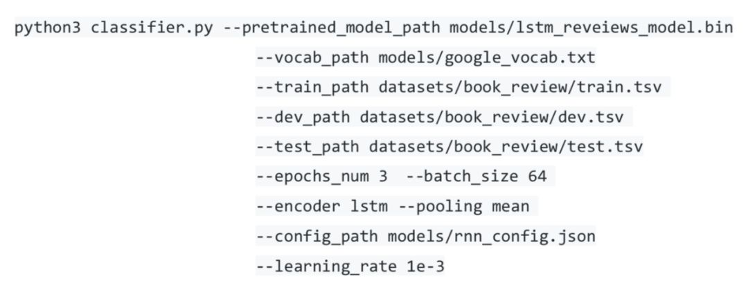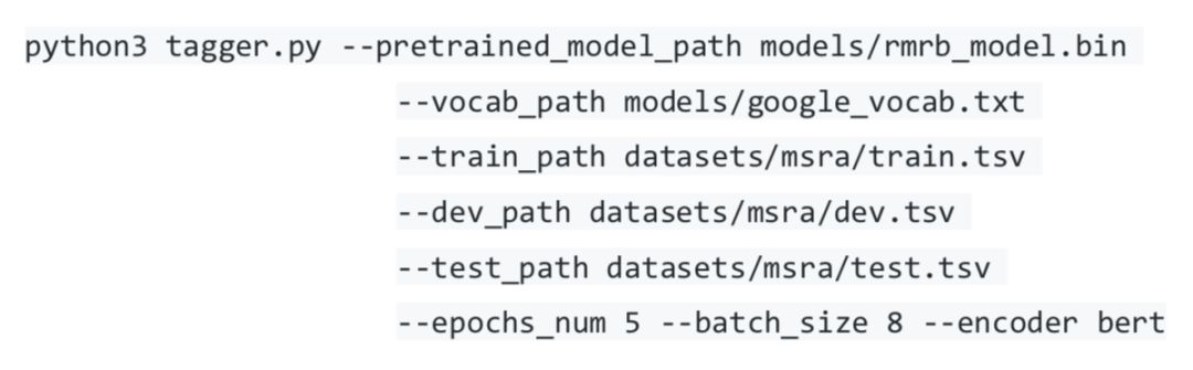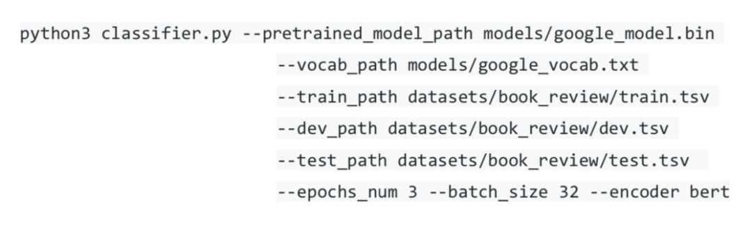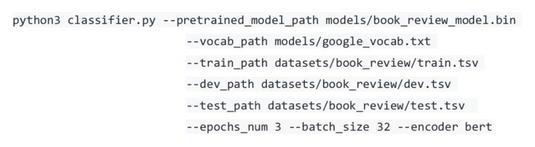 这里简单介绍一下各个选项的意义:--pretrained_model_path 指定预训练模型的路径;--vocab_path 指定词典的路径;下游任务数据集路径通过 --train_path、--dev_path、--test_path 指定;--encoder 指定我们使用的编码器,这里使用 BERT 中的 12 层 Transformer 编码器。