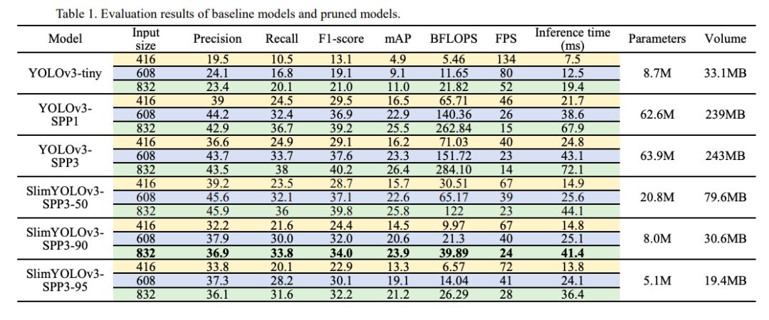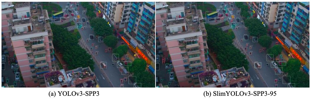 UAV Applications,作者对YOLOv3的改进版进行了剪枝,在参数量、占用内存、推断时间大幅减少的情况下,在无人机目标检测数据集上实现了与原算法可比较的检测精度。