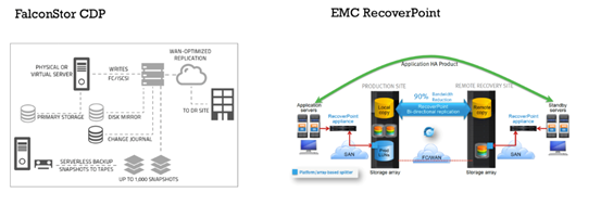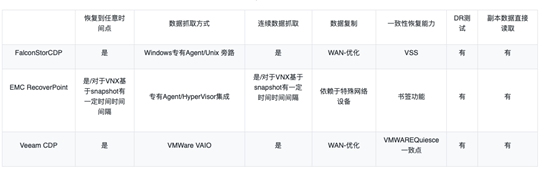 不同的传统厂商建立了不同的连续数据保护保护模型,参考SNIA的存储共享模型, 可以将实现连续数据保护的产品或解决方案分为基于应用、基于文件和基于数据块的连续数据保护保护。本文主要从数据块层面讲CDP的实现。基于块的CDP功能直接运行在物理的存储设备或逻辑的卷管理器上,甚至也可以运行在数据传输层上。当数据块写入生产数据的存储设备时,CDP系统可以捕获数据的拷贝并将其存放在另外一个存储设备中。 基于数据块的数据保护又有基于主机层、基于传输层和基于存储层三类实现方式。 下面以FalconStorCDP、VeeamCDP及EMC RecoverPoint这3个厂商,从不同背景进行分析,具有一定的代表性:飞康是传统的连续数据保护产品的代表。EMC传统的存储厂商,收购以前的RecoverPoint打造自己的数据保护套件, 方案建立在自己的存储上,提供物理机到虚拟机的保护方案。Veeam 是虚拟机保护的后起之秀,主打虚拟化平台上,VMWARE 及 HYPERV的数据保护,扩展到云端,目前的方案依赖于VMWare的VAIO 虚拟化数据获取框架。EMCRecoverPoint/SE 是针对 EMC CLARiiON 系列阵列的全面解决方案,而 EMC RecoverPoint则是针对整个数据中心的全面解决方案。两种产品都提供了使用连续数据保护 (CDP)的同步本地复制,以及具有任意时间点恢复功能的同步和异步连续远程复制 (CRR)。在RecoverPoint 应用装置上同时运行CDP和CRR实现本地和远程(CLR) 数据保护,使您能够用单个解决方案同时在本地和远程保护相同数据。 飞康CDP解决方案整合了数据备份、系统恢复、灾难恢复、本地及异地容灾等多项功能。飞康CDP是基于磁盘的备份与容灾一体化解决方案,实现文件/数据库/操作系统的实时备份与瞬间恢复;实现了验证、演练的本地/异地容灾功能整合。AWS仅提供原生的快照功能及帮助客户上云的手段,数据备份等功能依赖于传统的数据保护厂商;Azure提供基于虚拟机的基本的备份及恢复方式,没有提供CDP等高级功能。根据Gartner的描述的弹性的云备份引擎,其中规定的了成功弹性备份的几个特征: