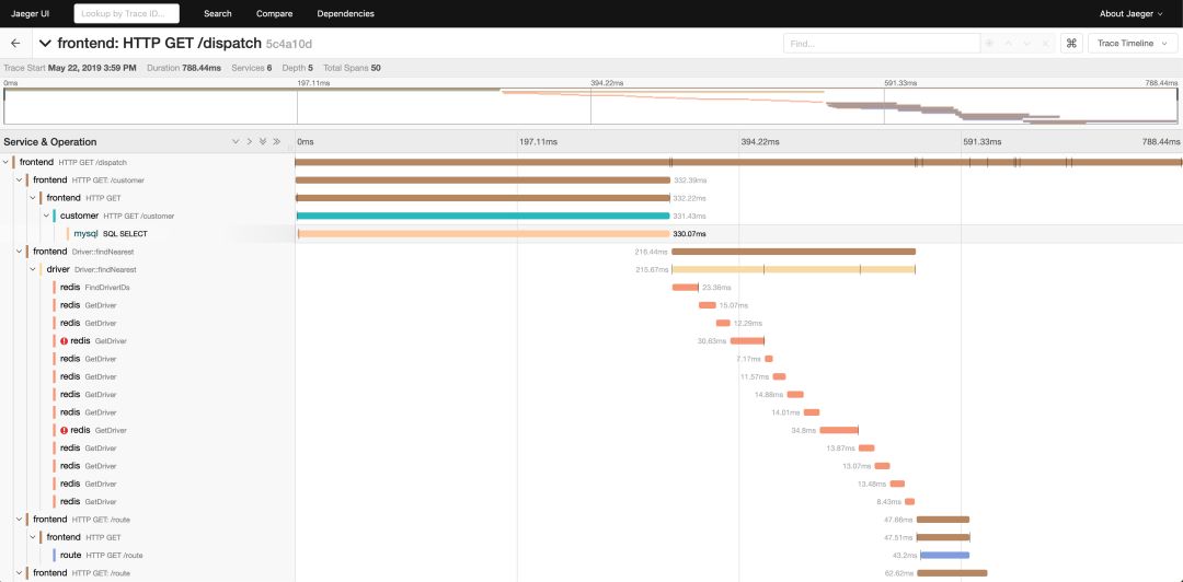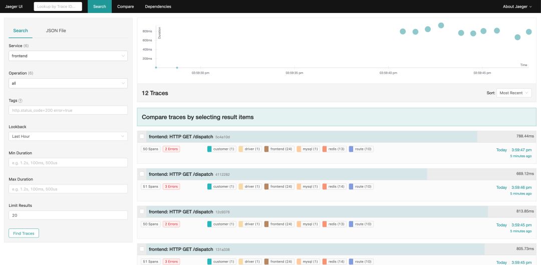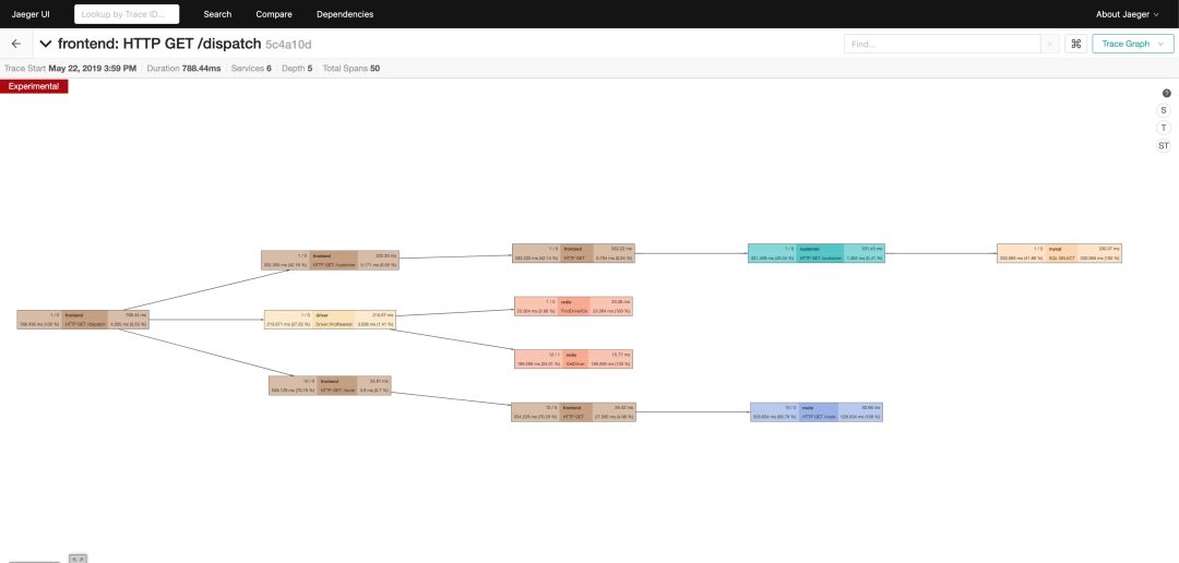 Query 从存储中检索 traces 并通过 一个漂亮的 UI 界面进行展现,目前支持搜索、过滤、traces 对比、查看依赖调用关系图等功能。