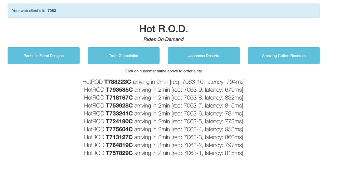 打开HotROD页面, 任意点击页面上的按钮,生成一些调用数据: