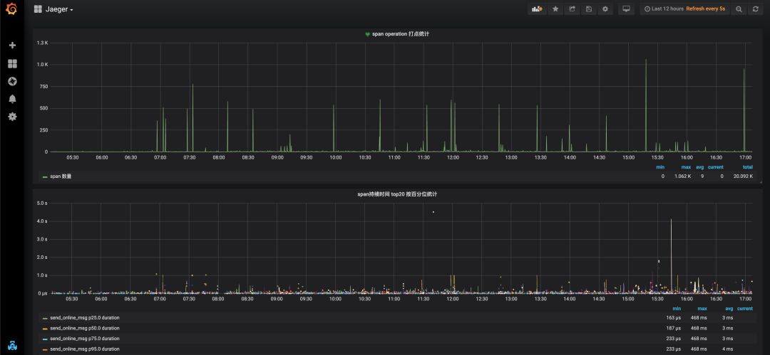 当前Jaeger缺少自带的报警机制,但是由于存储可以使用Elasticsearch,配合Grafana就可以实现简单的报警监控。