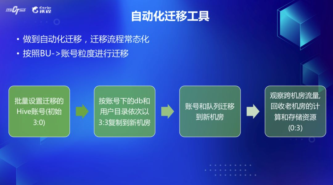 1)迁移过程会耗费大量跨机房网络带宽,需要在集群低峰时间执行,我们是放在早上10点到晚上11点之间,其他时间会自动暂停迁移,否则会影响线上报表和ETL作业的SLA。
