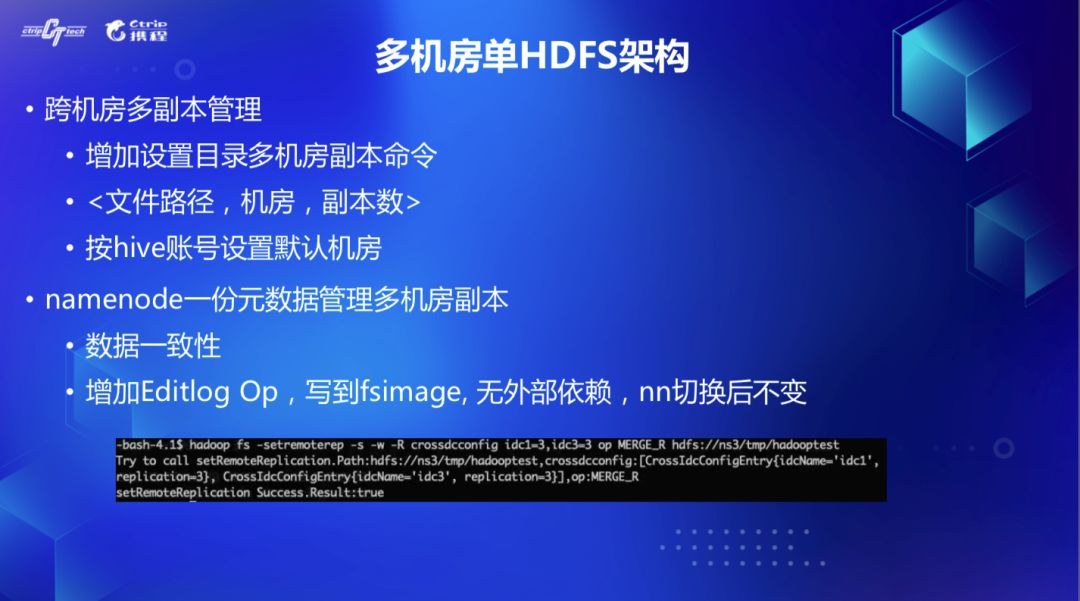 HDFS层面还有其他一些改造,比如Balancer,我们支持了多实例部署,每个Balancer增加IP范围列表,每个机房会起一个,只balance本机房IP的datanode的数据。对于Mover,我们也支持了多机房多实例部署,因为mover是在客户端选择目标副本节点的,所以需要改造按照目录的跨机房副本放置策略在客户端来选择合适的节点。