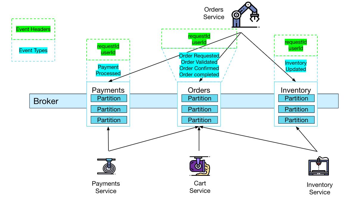例如,考虑我在整篇文章中使用的电子商务流程。 Orders 服务必须使用来自 3 个不同主题的多个事件,所有这些事件都与同一用户操作(在网上商店购买商品)相关。